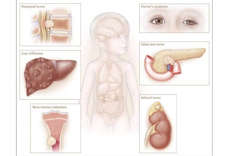 Прояви нейробластоми складаються із загальної симптоматики та специфічних проявів, залежно від місця локалізації.