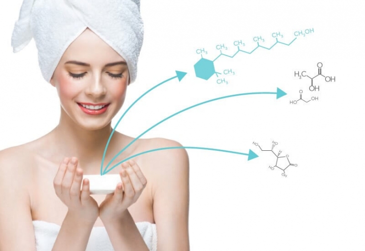 - Ретинілацетат: прискорює процес відлущування клітин, що відмирають, підвищує вироблення волокон колагену та еластину.